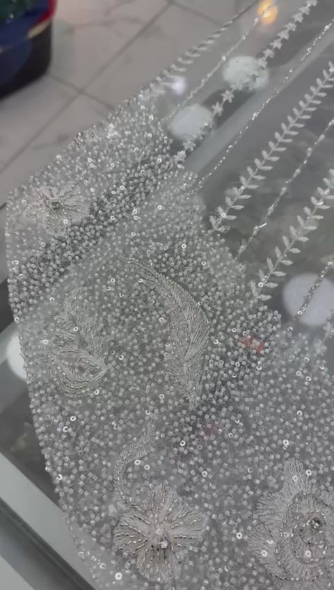 Şeffaf tül zemin üzerine dikey yaprak formunda ilerleyen işlemeler, alt kısımda yoğun ve zengin bir bordürle tamamlanarak ürüne şık ve dolgun bir görünüm kazandırır. Vitrin sunumları ve profesyonel çekimler için güçlü bir etki sağlar. Büyük adetli siparişler için ideal bir modeldir.