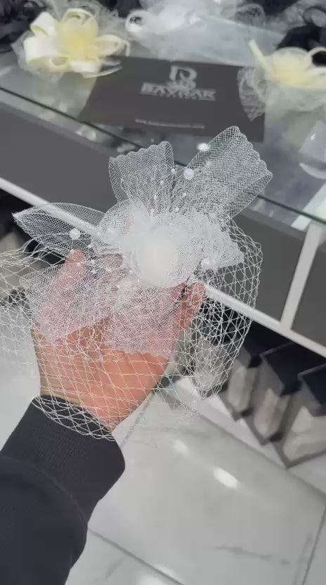 Zarif çiçek formu ve ince işçiliğiyle öne çıkan inci detaylı tüllü gelin saç aksesuarı, gelinlik ve özel gün kombinlerine romantik bir dokunuş katar. Katmanlı tül yapısı, file detaylar ve inci süslemelerle birleşerek hacimli ve göz alıcı bir görünüm sunar. Merkezde yer alan çiçek form detay, tasarıma feminen ve sofistike bir hava kazandırır.